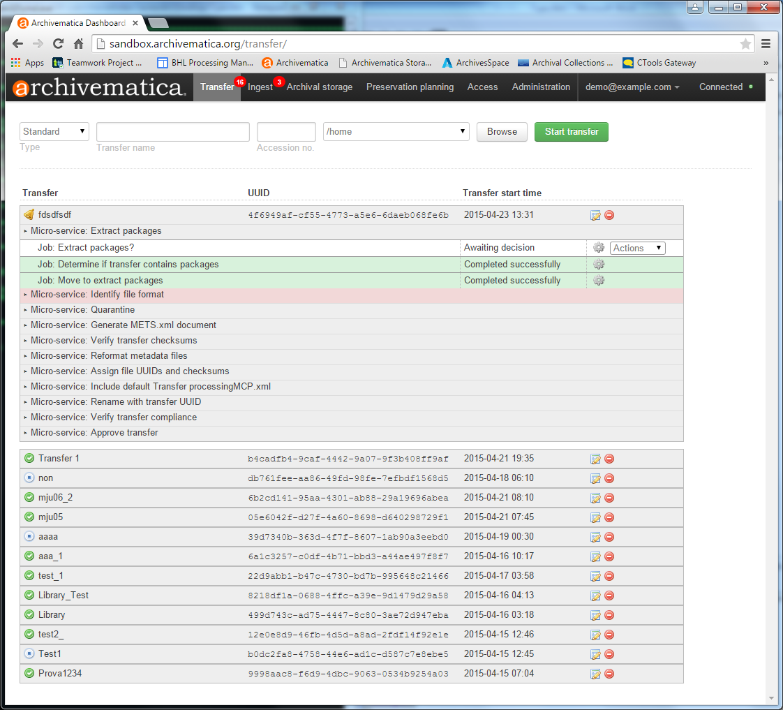 Using relevant procedures and workflows from Archivematica’s Testing page, I ran a number of representative transfers through Archivematica’s transfer and ingest micro-services using a variety of processing configurations.