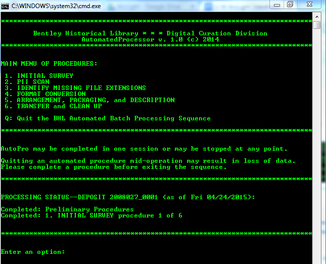 A previous post detailed the history of digital curation at the Bentley Historical Library. Relevant to our immediate conversation is Automated Processor (AutoPro), a homegrown tool that--if you couldn't guess from its name--automates digital processing from "Initial Survey" through "Deposit Content in Deep Blue" using 33 Windows CMD.EXE shell scripts that control more than 20 applications and various command line utilities:
